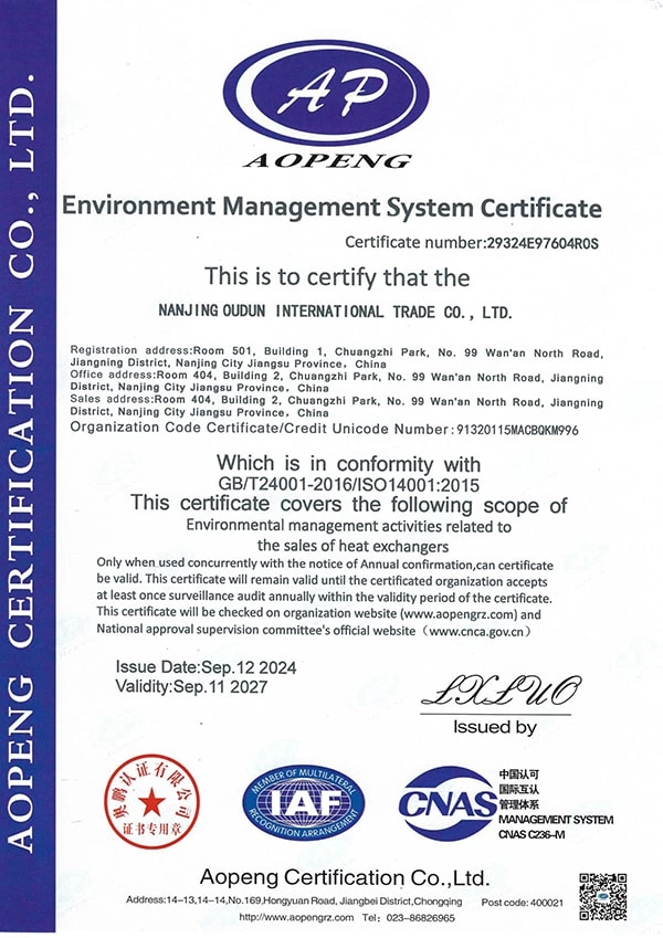 Nuestros intercambiadores de calor se fabrican de acuerdo con estándares reconocidos internacionalmente y están certificados por autoridades acreditadas. Cada certificación refleja nuestro compromiso con el control de calidad, la seguridad del producto y la confiabilidad operativa a largo plazo. Desde la selección del material hasta la inspección final, cada paso se gestiona estrictamente para garantizar un rendimiento constante en diversas aplicaciones industriales.